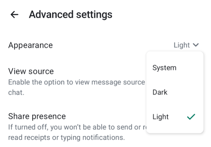 In der Anwendung gehen Sie zu Einstellungen > Erweiterte Einstellungen. Unter Darstellung haben Sie die Wahl zwischen System, Hell oder Dunkel.