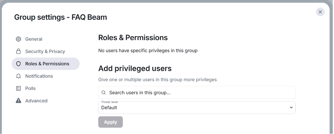 Roles & Permissions and Add authorized users, you can designate a member of the group as an administrator or moderator.