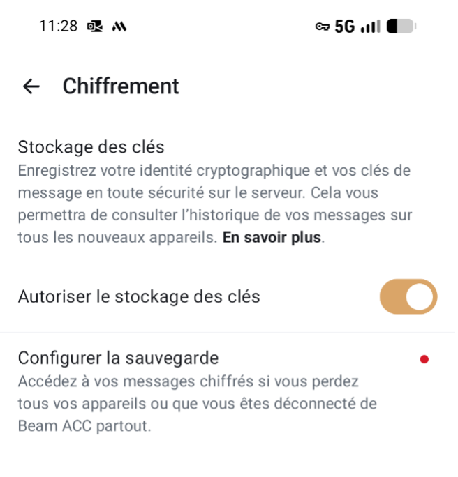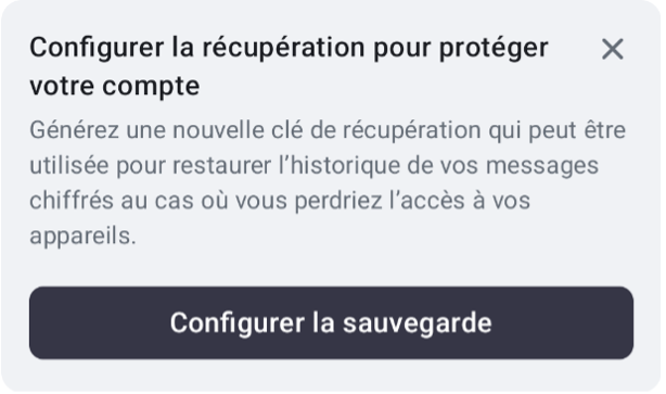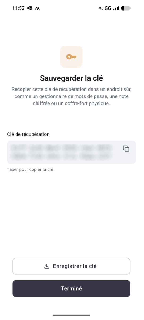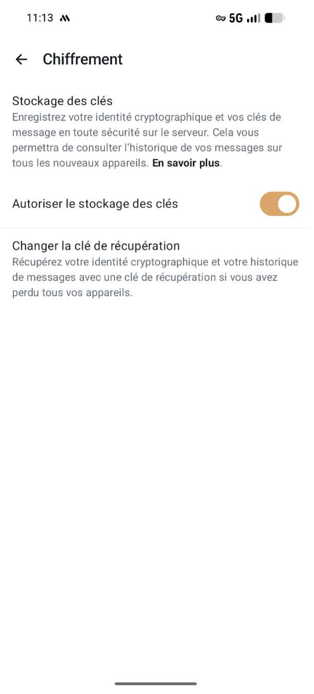 Lors de la création de votre compte, vous pouvez créer votre "clé de récupération". Conservez-la dans un endroit sûr, idéalement pas seulement sur votre téléphone. Seule cette "clé de récupération" vous permet de récupérer vos messages si vous devez réactiver votre compte. Vous pouvez créer cette "clé de récupération" sous la section "Chiffrement" dans l'application.