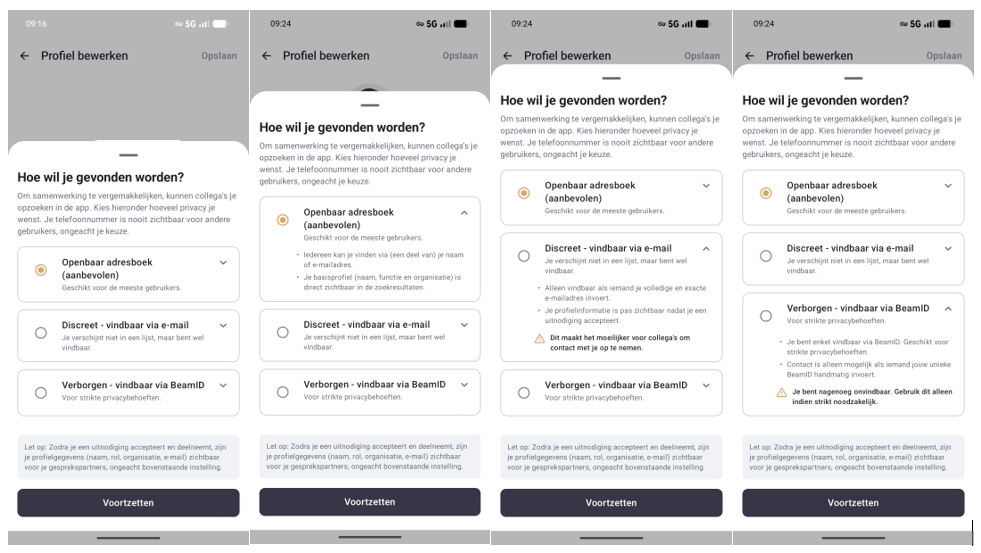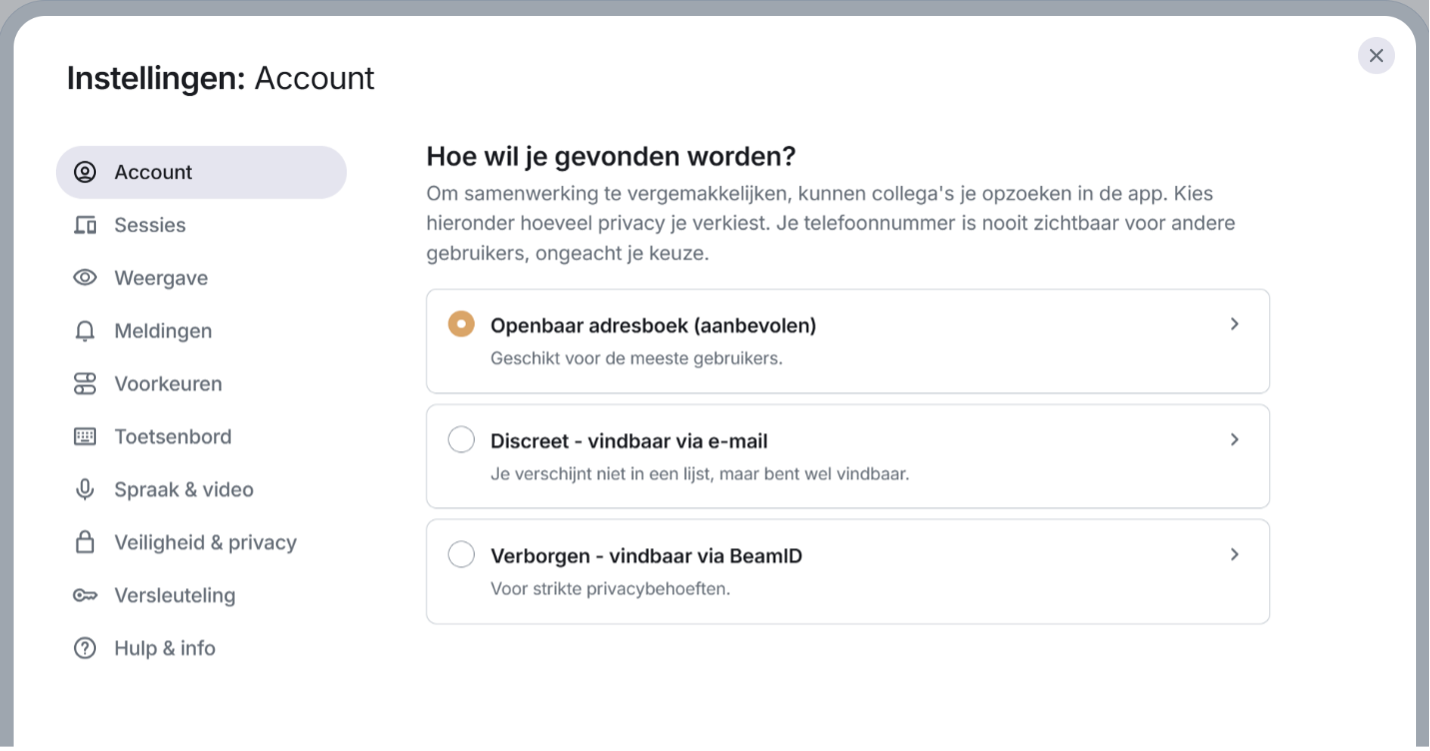 Hoe kan ik de wijze veranderen hoe ik vindbaar ben in Beam?